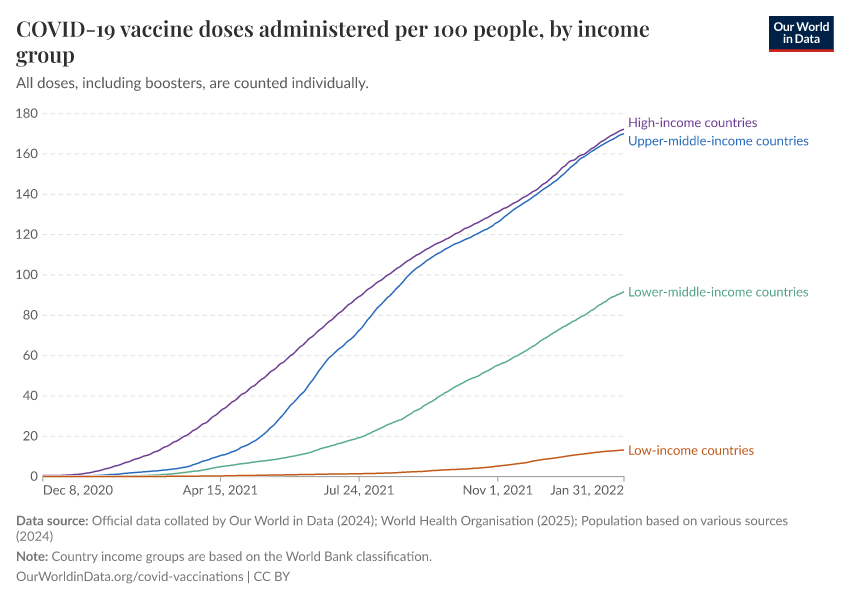 “Data Page: COVID-19 vaccine doses administered per 100 people, by income group”, part of the following publication: Edouard Mathieu, Hannah Ritchie, Lucas Rodés-Guirao, Cameron Appel, Daniel Gavrilov, Charlie Giattino, Joe Hasell, Bobbie Macdonald, Saloni Dattani, Diana Beltekian, Esteban Ortiz-Ospina, and Max Roser (2020) - “COVID-19 Pandemic”. Data adapted from Official data collated by Our World in Data, World Health Organisation, Various sources. Retrieved from https://archive.ourworldindata.org/20250925-233948/grapher/cumulative-covid-vaccinations-income-group.html [online resource] (archived on September 25, 2025).
