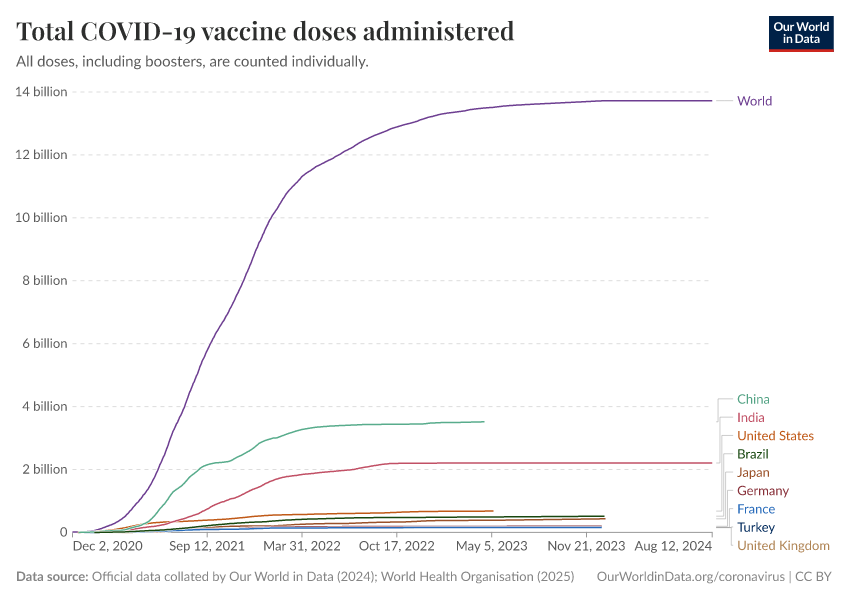 “Data Page: Total COVID-19 vaccine doses administered”, part of the following publication: Edouard Mathieu, Hannah Ritchie, Lucas Rodés-Guirao, Cameron Appel, Daniel Gavrilov, Charlie Giattino, Joe Hasell, Bobbie Macdonald, Saloni Dattani, Diana Beltekian, Esteban Ortiz-Ospina, and Max Roser (2020) - “COVID-19 Pandemic”. Data adapted from Official data collated by Our World in Data, World Health Organisation. Retrieved from https://archive.ourworldindata.org/20250909-093708/grapher/cumulative-covid-vaccinations.html [online resource] (archived on September 9, 2025).