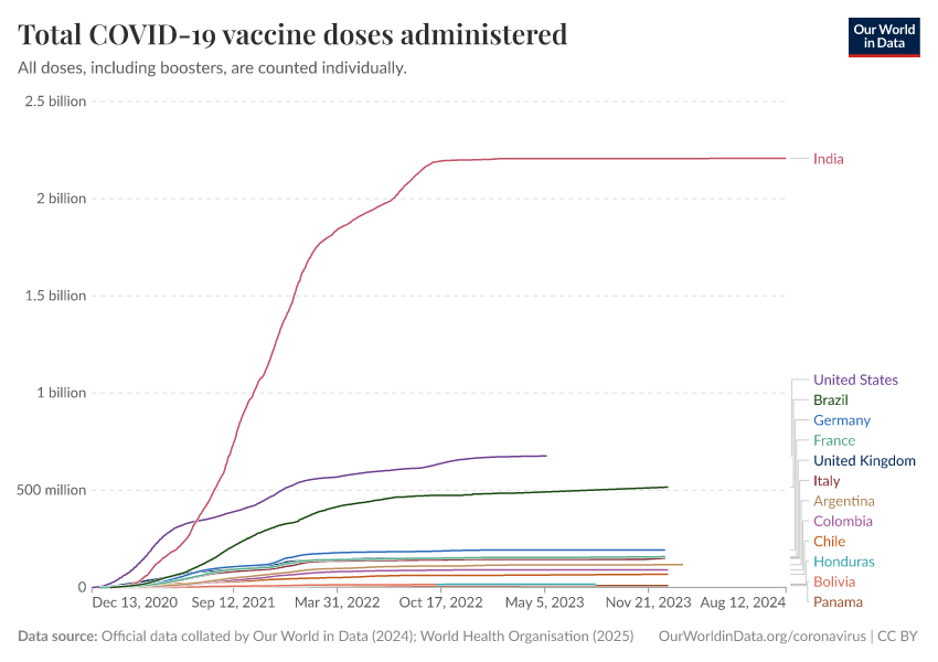 “Data Page: Total COVID-19 vaccine doses administered”, part of the following publication: Edouard Mathieu, Hannah Ritchie, Lucas Rodés-Guirao, Cameron Appel, Daniel Gavrilov, Charlie Giattino, Joe Hasell, Bobbie Macdonald, Saloni Dattani, Diana Beltekian, Esteban Ortiz-Ospina, and Max Roser (2020) - “COVID-19 Pandemic”. Data adapted from Official data collated by Our World in Data, World Health Organisation. Retrieved from https://archive.ourworldindata.org/20250909-093708/grapher/cumulative-covid-vaccinations.html [online resource] (archived on September 9, 2025).