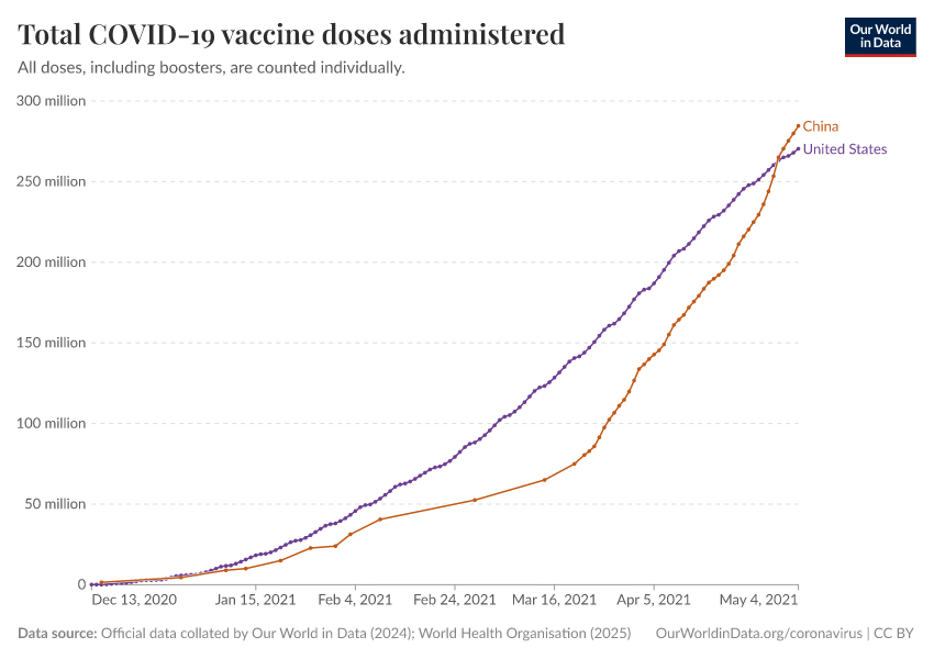 “Data Page: Total COVID-19 vaccine doses administered”, part of the following publication: Edouard Mathieu, Hannah Ritchie, Lucas Rodés-Guirao, Cameron Appel, Daniel Gavrilov, Charlie Giattino, Joe Hasell, Bobbie Macdonald, Saloni Dattani, Diana Beltekian, Esteban Ortiz-Ospina, and Max Roser (2020) - “COVID-19 Pandemic”. Data adapted from Official data collated by Our World in Data, World Health Organisation. Retrieved from https://archive.ourworldindata.org/20250909-093708/grapher/cumulative-covid-vaccinations.html [online resource] (archived on September 9, 2025).How to cite this data