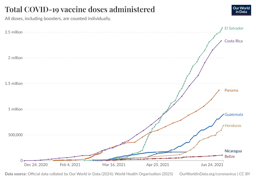 - Vaccination data reflects the total number of doses administered—covering both primary series and booster doses—and are now sourced exclusively from WHO.