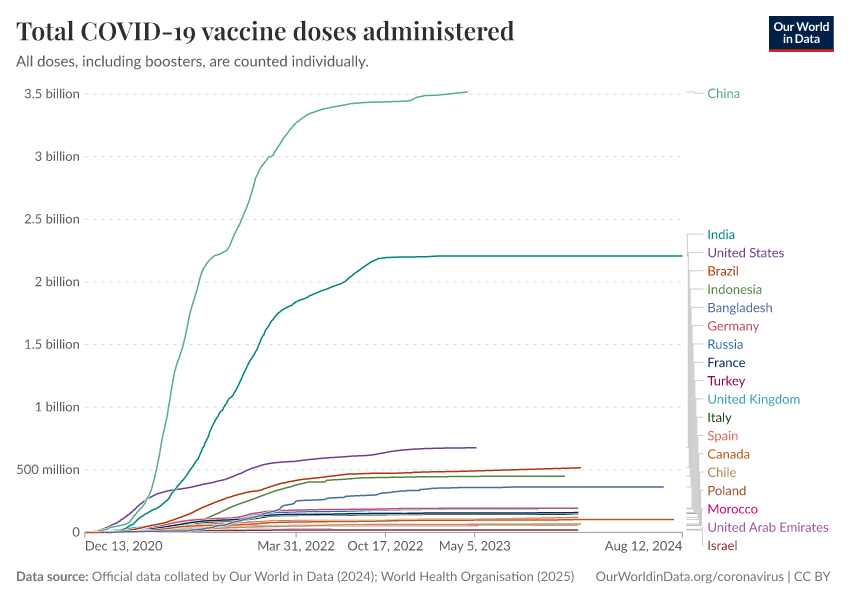 “Data Page: Total COVID-19 vaccine doses administered”, part of the following publication: Edouard Mathieu, Hannah Ritchie, Lucas Rodés-Guirao, Cameron Appel, Daniel Gavrilov, Charlie Giattino, Joe Hasell, Bobbie Macdonald, Saloni Dattani, Diana Beltekian, Esteban Ortiz-Ospina, and Max Roser (2020) - “COVID-19 Pandemic”. Data adapted from Official data collated by Our World in Data, World Health Organisation. Retrieved from https://archive.ourworldindata.org/20260119-065148/grapher/cumulative-covid-vaccinations.html [online resource] (archived on January 19, 2026).How to cite this data