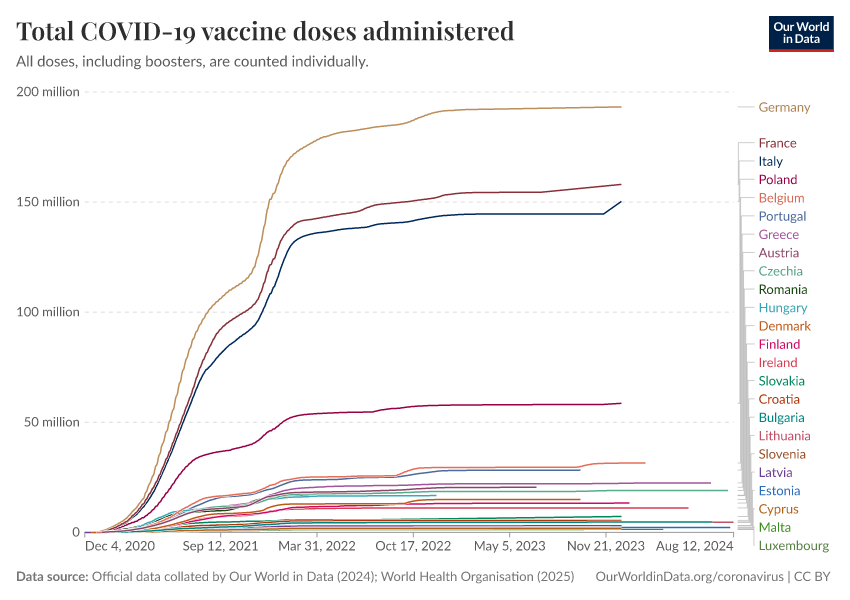 “Data Page: Total COVID-19 vaccine doses administered”, part of the following publication: Edouard Mathieu, Hannah Ritchie, Lucas Rodés-Guirao, Cameron Appel, Daniel Gavrilov, Charlie Giattino, Joe Hasell, Bobbie Macdonald, Saloni Dattani, Diana Beltekian, Esteban Ortiz-Ospina, and Max Roser (2020) - “COVID-19 Pandemic”. Data adapted from Official data collated by Our World in Data, World Health Organisation. Retrieved from https://archive.ourworldindata.org/20250909-093708/grapher/cumulative-covid-vaccinations.html [online resource] (archived on September 9, 2025).How to cite this data