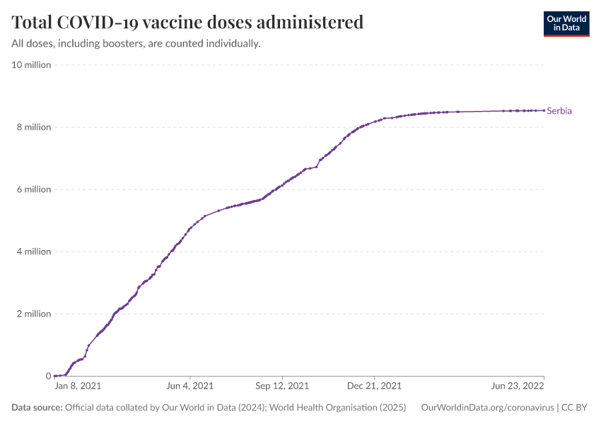 “Data Page: Total COVID-19 vaccine doses administered”, part of the following publication: Edouard Mathieu, Hannah Ritchie, Lucas Rodés-Guirao, Cameron Appel, Daniel Gavrilov, Charlie Giattino, Joe Hasell, Bobbie Macdonald, Saloni Dattani, Diana Beltekian, Esteban Ortiz-Ospina, and Max Roser (2020) - “COVID-19 Pandemic”. Data adapted from Official data collated by Our World in Data, World Health Organisation. Retrieved from https://archive.ourworldindata.org/20260119-065148/grapher/cumulative-covid-vaccinations.html [online resource] (archived on January 19, 2026).How to cite this data