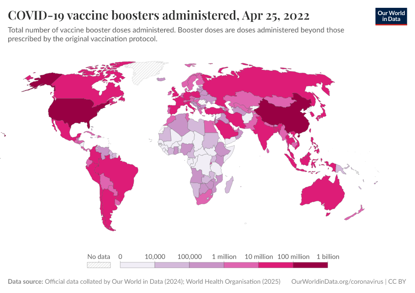 “Data Page: COVID-19 vaccine boosters administered”, part of the following publication: Edouard Mathieu, Hannah Ritchie, Lucas Rodés-Guirao, Cameron Appel, Daniel Gavrilov, Charlie Giattino, Joe Hasell, Bobbie Macdonald, Saloni Dattani, Diana Beltekian, Esteban Ortiz-Ospina, and Max Roser (2020) - “COVID-19 Pandemic”. Data adapted from Official data collated by Our World in Data, World Health Organisation. Retrieved from https://archive.ourworldindata.org/20250909-093708/grapher/cumulative-covid-vaccine-booster-doses.html [online resource] (archived on September 9, 2025).How to cite this data