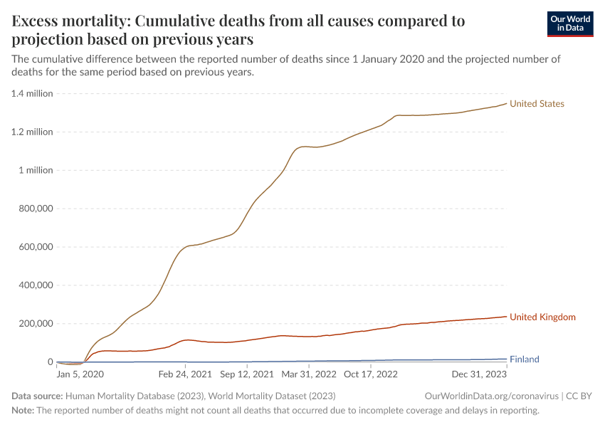 Human Mortality Database; World Mortality Dataset (2024); Karlinsky and Kobak (2021); Human Mortality Database (2025); World Mortality Database (2024); Karlinsky & Kobak (2024) – processed by Our World in Data. “Excess mortality: Cumulative deaths from all causes compared to projection based on previous years” [dataset]. Human Mortality Database, “Human Mortality Database”; World Mortality Database, “World Mortality Database”; Karlinsky & Kobak, “Excess mortality during the COVID-19 pandemic” [original data]. Retrieved December 21, 2025 from https://archive.ourworldindata.org/20251220-063401/grapher/cumulative-excess-deaths-covid.html (archived on December 20, 2025).