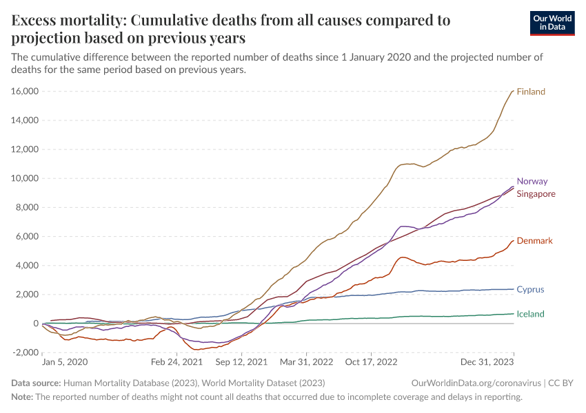 Human Mortality Database; World Mortality Dataset (2024); Karlinsky and Kobak (2021); Human Mortality Database (2025); World Mortality Database (2024); Karlinsky & Kobak (2024) – processed by Our World in Data. “Excess mortality: Cumulative deaths from all causes compared to projection based on previous years” [dataset]. Human Mortality Database, “Human Mortality Database”; World Mortality Database, “World Mortality Database”; Karlinsky & Kobak, “Excess mortality during the COVID-19 pandemic” [original data]. Retrieved December 21, 2025 from https://archive.ourworldindata.org/20251221-063341/grapher/cumulative-excess-deaths-covid.html (archived on December 21, 2025).