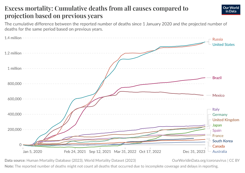 Human Mortality Database; World Mortality Dataset (2024); Karlinsky and Kobak (2021); Human Mortality Database (2025); World Mortality Database (2024); Karlinsky & Kobak (2024) – processed by Our World in Data. “Excess mortality: Cumulative deaths from all causes compared to projection based on previous years” [dataset]. Human Mortality Database, “Human Mortality Database”; World Mortality Database, “World Mortality Database”; Karlinsky & Kobak, “Excess mortality during the COVID-19 pandemic” [original data]. Retrieved December 30, 2025 from https://archive.ourworldindata.org/20251229-063330/grapher/cumulative-excess-deaths-covid.html (archived on December 29, 2025).