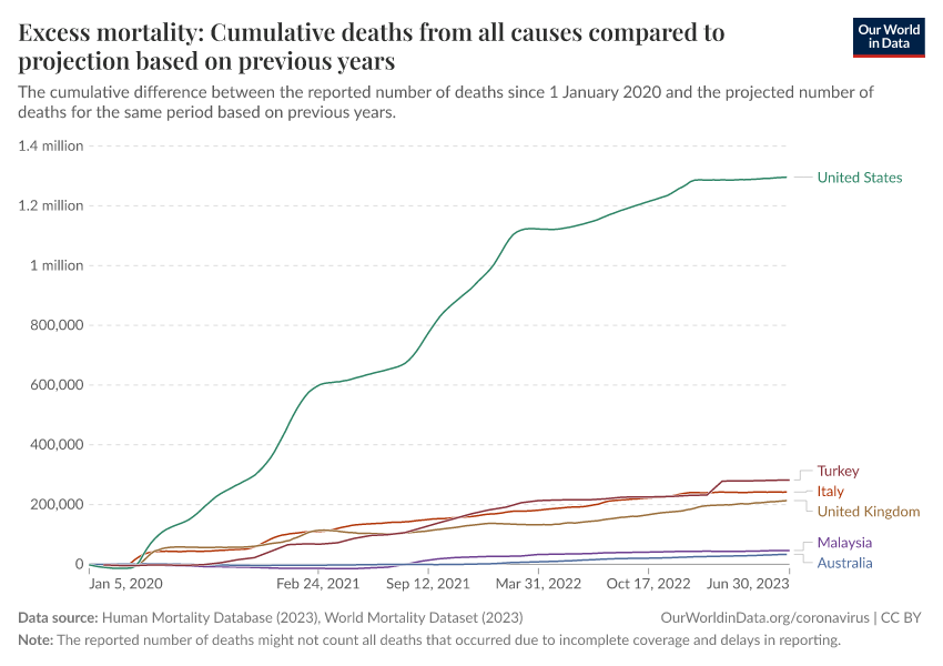 “Data Page: Excess mortality: Cumulative deaths from all causes compared to projection based on previous years”. Our World in Data (2026). Data adapted from Human Mortality Database, World Mortality Database, Karlinsky & Kobak. Retrieved from https://archive.ourworldindata.org/20260415-063805/grapher/cumulative-excess-deaths-covid.html [online resource] (archived on April 15, 2026).How to cite this data