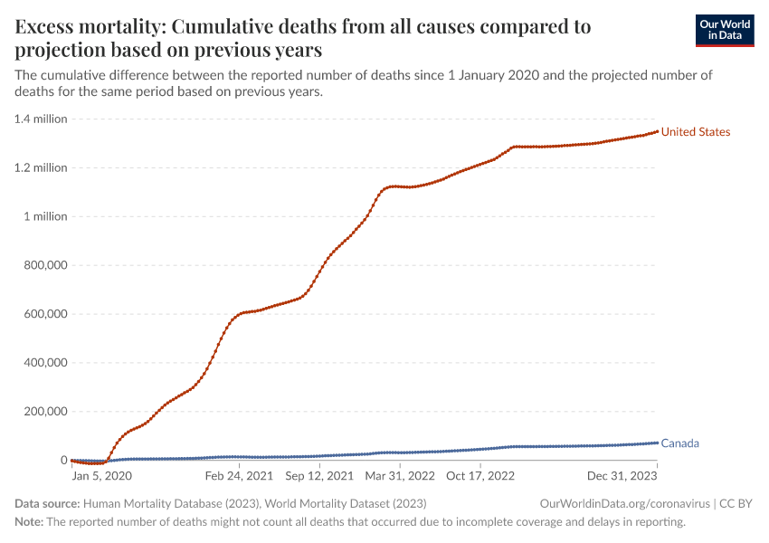 Human Mortality Database; World Mortality Dataset (2024); Karlinsky and Kobak (2021); Human Mortality Database (2025); World Mortality Database (2024); Karlinsky & Kobak (2024) – processed by Our World in Data. “Excess mortality: Cumulative deaths from all causes compared to projection based on previous years” [dataset]. Human Mortality Database, “Human Mortality Database”; World Mortality Database, “World Mortality Database”; Karlinsky & Kobak, “Excess mortality during the COVID-19 pandemic” [original data]. Retrieved December 7, 2025 from https://archive.ourworldindata.org/20251207-063327/grapher/cumulative-excess-deaths-covid.html (archived on December 7, 2025).