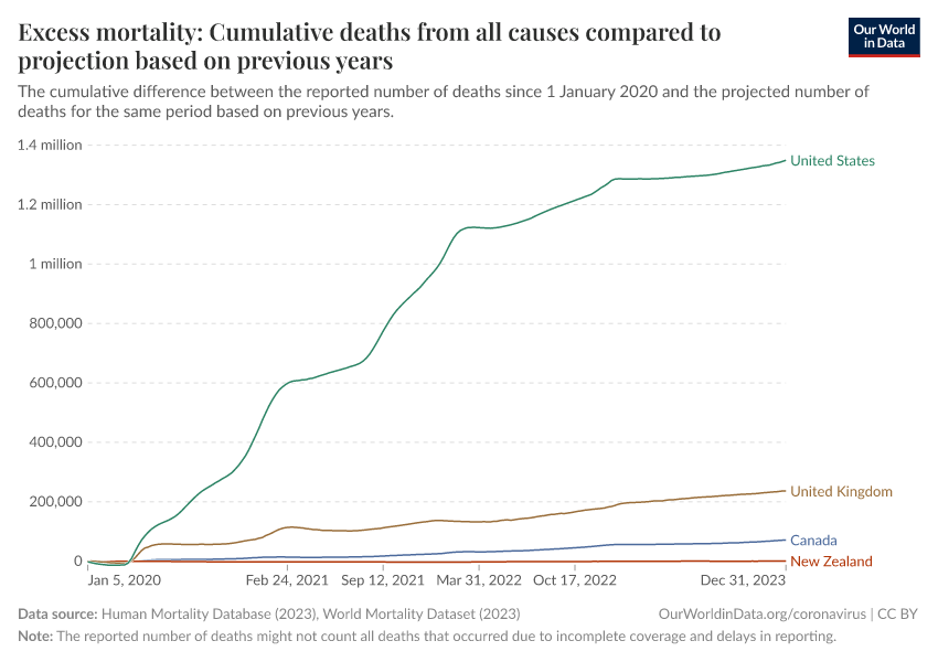 Human Mortality Database; World Mortality Dataset (2024); Karlinsky and Kobak (2021); Human Mortality Database (2025); World Mortality Database (2024); Karlinsky & Kobak (2024) – processed by Our World in Data. “Excess mortality: Cumulative deaths from all causes compared to projection based on previous years” [dataset]. Human Mortality Database, “Human Mortality Database”; World Mortality Database, “World Mortality Database”; Karlinsky & Kobak, “Excess mortality during the COVID-19 pandemic” [original data]. Retrieved December 7, 2025 from https://archive.ourworldindata.org/20251207-063327/grapher/cumulative-excess-deaths-covid.html (archived on December 7, 2025).