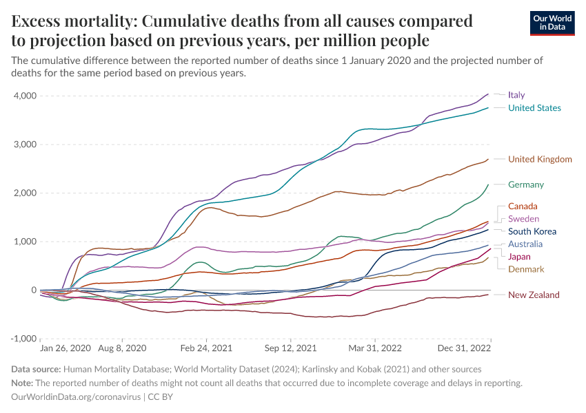 “Data Page: Excess mortality: Cumulative deaths from all causes compared to projection based on previous years, per million people”. Our World in Data (2025). Data adapted from Human Mortality Database, World Mortality Database, Karlinsky & Kobak. Retrieved from https://archive.ourworldindata.org/20251214-063417/grapher/cumulative-excess-deaths-per-million-covid.html [online resource] (archived on December 14, 2025).How to cite this data