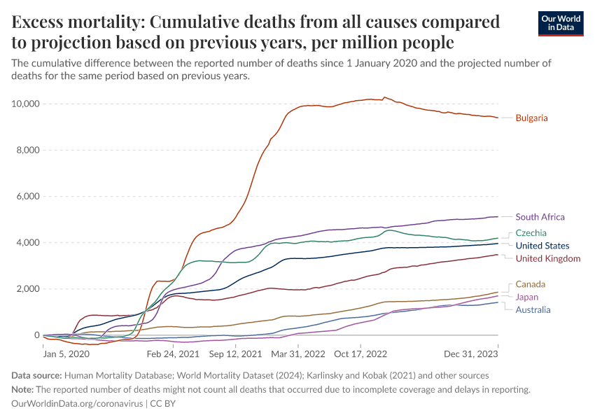“Data Page: Excess mortality: Cumulative deaths from all causes compared to projection based on previous years, per million people”. Our World in Data (2026). Data adapted from Human Mortality Database, World Mortality Database, Karlinsky & Kobak. Retrieved from https://archive.ourworldindata.org/20260403-063310/grapher/cumulative-excess-deaths-per-million-covid.html [online resource] (archived on April 3, 2026).How to cite this data