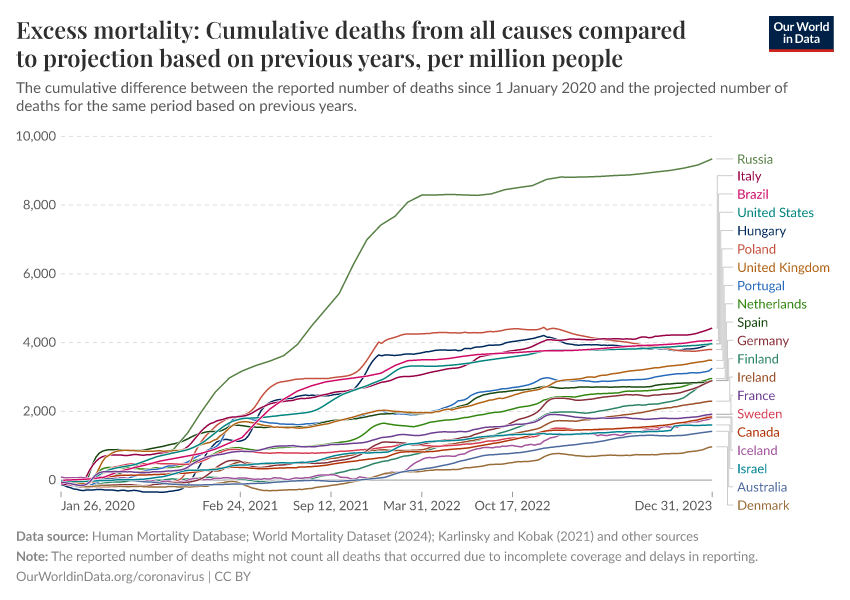 “Data Page: Excess mortality: Cumulative deaths from all causes compared to projection based on previous years, per million people”. Our World in Data (2025). Data adapted from Human Mortality Database, World Mortality Database, Karlinsky & Kobak. Retrieved from https://archive.ourworldindata.org/20251223-063440/grapher/cumulative-excess-deaths-per-million-covid.html [online resource] (archived on December 23, 2025).How to cite this data