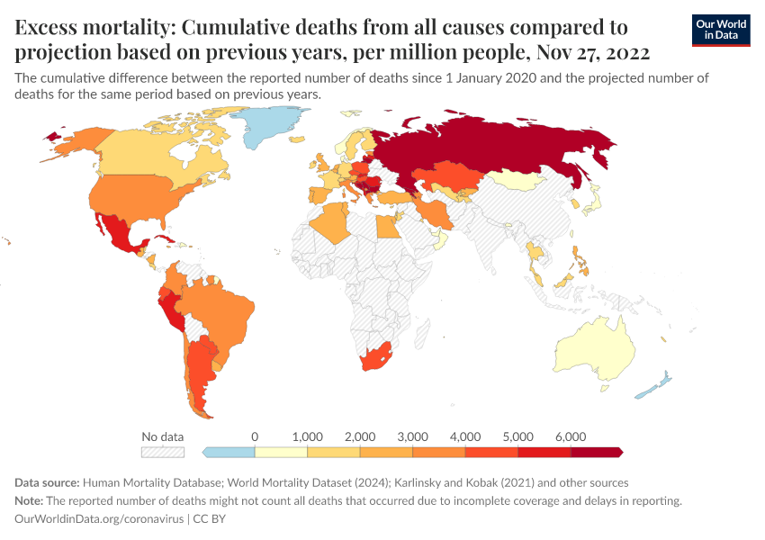 “Data Page: Excess mortality: Cumulative deaths from all causes compared to projection based on previous years, per million people”. Our World in Data (2026). Data adapted from Human Mortality Database, World Mortality Database, Karlinsky & Kobak. Retrieved from https://archive.ourworldindata.org/20260307-063352/grapher/cumulative-excess-deaths-per-million-covid.html [online resource] (archived on March 7, 2026).