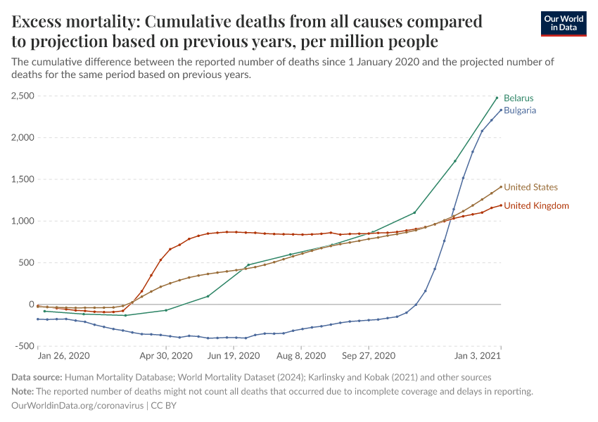 “Data Page: Excess mortality: Cumulative deaths from all causes compared to projection based on previous years, per million people”. Our World in Data (2025). Data adapted from Human Mortality Database, World Mortality Database, Karlinsky & Kobak. Retrieved from https://archive.ourworldindata.org/20251207-063327/grapher/cumulative-excess-deaths-per-million-covid.html [online resource] (archived on December 7, 2025).How to cite this data