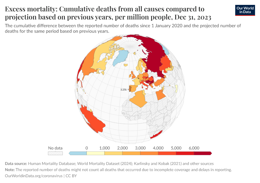 “Data Page: Excess mortality: Cumulative deaths from all causes compared to projection based on previous years, per million people”. Our World in Data (2025). Data adapted from Human Mortality Database, World Mortality Database, Karlinsky & Kobak. Retrieved from https://archive.ourworldindata.org/20251227-063305/grapher/cumulative-excess-deaths-per-million-covid.html [online resource] (archived on December 27, 2025).How to cite this data