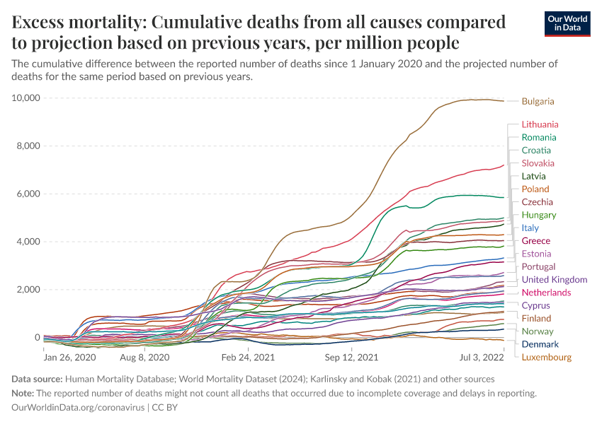 “Data Page: Excess mortality: Cumulative deaths from all causes compared to projection based on previous years, per million people”. Our World in Data (2025). Data adapted from Human Mortality Database, World Mortality Database, Karlinsky & Kobak. Retrieved from https://archive.ourworldindata.org/20251214-063417/grapher/cumulative-excess-deaths-per-million-covid.html [online resource] (archived on December 14, 2025).How to cite this data