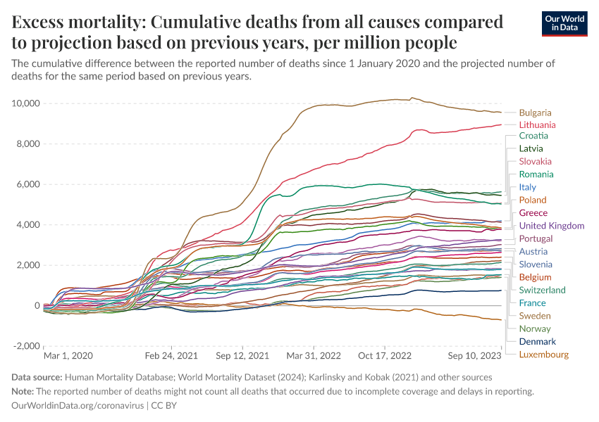 “Data Page: Excess mortality: Cumulative deaths from all causes compared to projection based on previous years, per million people”. Our World in Data (2025). Data adapted from Human Mortality Database, World Mortality Database, Karlinsky & Kobak. Retrieved from https://archive.ourworldindata.org/20251214-063417/grapher/cumulative-excess-deaths-per-million-covid.html [online resource] (archived on December 14, 2025).How to cite this data