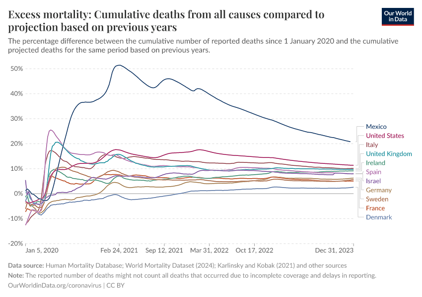 “Data Page: Excess mortality: Cumulative deaths from all causes compared to projection based on previous years”. Our World in Data (2025). Data adapted from Human Mortality Database, World Mortality Database, Karlinsky & Kobak. Retrieved from https://archive.ourworldindata.org/20251211-063340/grapher/cumulative-excess-mortality-p-scores-projected-baseline.html [online resource] (archived on December 11, 2025).How to cite this data