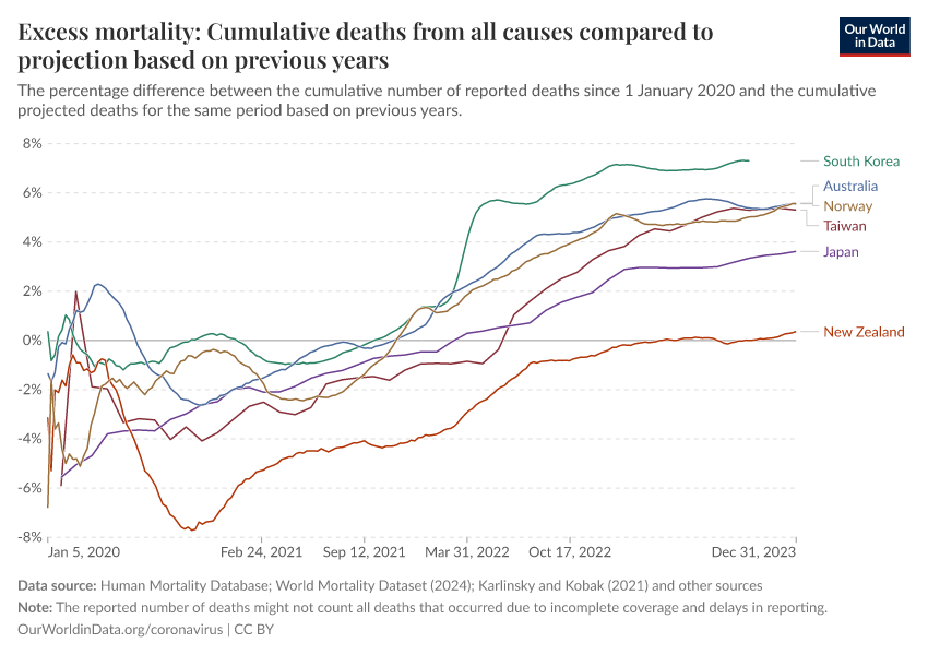 Human Mortality Database; World Mortality Dataset (2024); Karlinsky and Kobak (2021); Human Mortality Database (2025); World Mortality Database (2024); Karlinsky & Kobak (2024) – processed by Our World in Data. “Excess mortality: Cumulative deaths from all causes compared to projection based on previous years” [dataset]. Human Mortality Database, “Human Mortality Database”; World Mortality Database, “World Mortality Database”; Karlinsky & Kobak, “Excess mortality during the COVID-19 pandemic” [original data]. Retrieved April 20, 2026 from https://archive.ourworldindata.org/20260420-063317/grapher/cumulative-excess-mortality-p-scores-projected-baseline.html (archived on April 20, 2026).Download