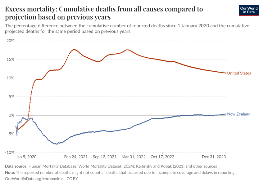 Human Mortality Database; World Mortality Dataset (2024); Karlinsky and Kobak (2021); Human Mortality Database (2025); World Mortality Database (2024); Karlinsky & Kobak (2024) – processed by Our World in Data. “Excess mortality: Cumulative deaths from all causes compared to projection based on previous years” [dataset]. Human Mortality Database, “Human Mortality Database”; World Mortality Database, “World Mortality Database”; Karlinsky & Kobak, “Excess mortality during the COVID-19 pandemic” [original data]. Retrieved April 14, 2026 from https://archive.ourworldindata.org/20260414-063332/grapher/cumulative-excess-mortality-p-scores-projected-baseline.html (archived on April 14, 2026).Download