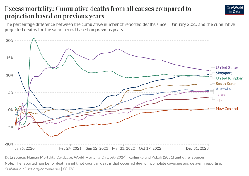 Human Mortality Database; World Mortality Dataset (2024); Karlinsky and Kobak (2021); Human Mortality Database (2025); World Mortality Database (2024); Karlinsky & Kobak (2024) – processed by Our World in Data. “Excess mortality: Cumulative deaths from all causes compared to projection based on previous years” [dataset]. Human Mortality Database, “Human Mortality Database”; World Mortality Database, “World Mortality Database”; Karlinsky & Kobak, “Excess mortality during the COVID-19 pandemic” [original data]. Retrieved January 13, 2026 from https://archive.ourworldindata.org/20260113-063322/grapher/cumulative-excess-mortality-p-scores-projected-baseline.html (archived on January 13, 2026).