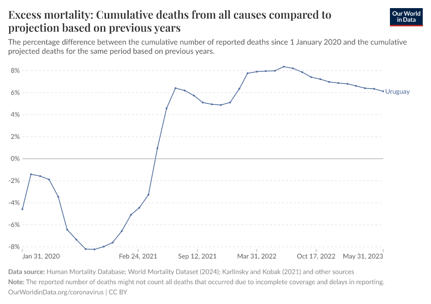 “Data Page: Excess mortality: Cumulative deaths from all causes compared to projection based on previous years”. Our World in Data (2025). Data adapted from Human Mortality Database, World Mortality Database, Karlinsky & Kobak. Retrieved from https://archive.ourworldindata.org/20251218-063317/grapher/cumulative-excess-mortality-p-scores-projected-baseline.html [online resource] (archived on December 18, 2025).How to cite this data