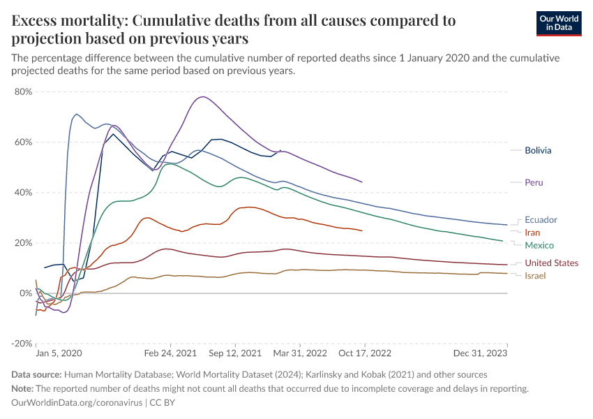 “Data Page: Excess mortality: Cumulative deaths from all causes compared to projection based on previous years”. Our World in Data (2026). Data adapted from Human Mortality Database, World Mortality Database, Karlinsky & Kobak. Retrieved from https://archive.ourworldindata.org/20260403-063310/grapher/cumulative-excess-mortality-p-scores-projected-baseline.html [online resource] (archived on April 3, 2026).How to cite this data