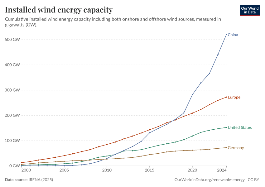 “Data Page: Total wind capacity”, part of the following publication: Hannah Ritchie, Pablo Rosado, and Max Roser (2023) - “Energy”. Data adapted from IRENA. Retrieved from https://archive.ourworldindata.org/20250909-093708/grapher/cumulative-installed-wind-energy-capacity-gigawatts.html [online resource] (archived on September 9, 2025).How to cite this data