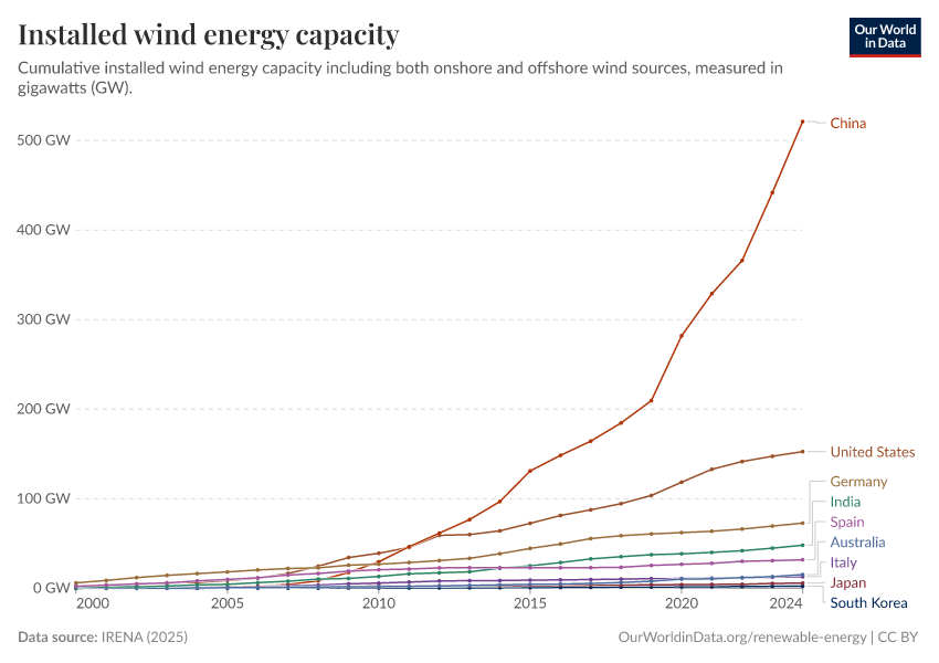 “Data Page: Total wind capacity”, part of the following publication: Hannah Ritchie, Pablo Rosado, and Max Roser (2023) - “Energy”. Data adapted from IRENA. Retrieved from https://archive.ourworldindata.org/20250909-093708/grapher/cumulative-installed-wind-energy-capacity-gigawatts.html [online resource] (archived on September 9, 2025).How to cite this data