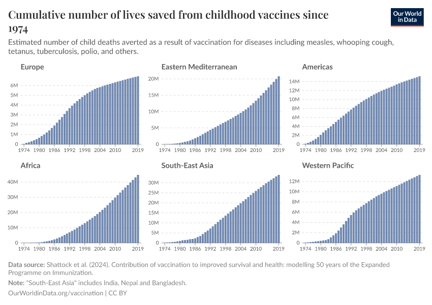 “Data Page: Cumulative number of lives saved from childhood vaccines since 1974”. Our World in Data (2025). Data adapted from Shattock et al. (2024). Contribution of vaccination to improved survival and health: modelling 50 years of the Expanded Programme on Immunization.. Retrieved from https://archive.ourworldindata.org/20250909-093708/grapher/cumulative-lives-saved-vaccination.html [online resource] (archived on September 9, 2025).How to cite this data