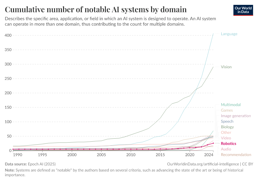 Epoch AI (2025) – with major processing by Our World in Data. “Cumulative number of notable AI systems by domain” [dataset]. Epoch AI, “Parameter, Compute and Data Trends in Machine Learning” [original data]. Retrieved December 20, 2025 from https://archive.ourworldindata.org/20251212-095432/grapher/cumulative-number-of-notable-ai-systems-by-domain.html (archived on December 12, 2025).