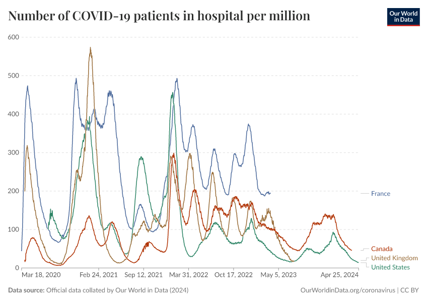 Official data collated by Our World in Data (2024) – processed by Our World in Data. “Number of COVID-19 patients in hospital per million” [dataset]. Official data collated by Our World in Data, “COVID-19, hospitalisations” [original data]. Retrieved January 12, 2026 from https://archive.ourworldindata.org/20250909-093708/grapher/current-covid-hospitalizations-per-million.html (archived on September 9, 2025).
