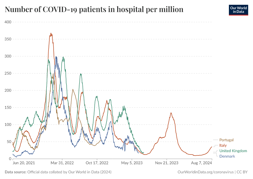 Official data collated by Our World in Data (2024) – processed by Our World in Data. “Number of COVID-19 patients in hospital per million” [dataset]. Official data collated by Our World in Data, “COVID-19, hospitalisations” [original data]. Retrieved December 15, 2025 from https://archive.ourworldindata.org/20250909-093708/grapher/current-covid-hospitalizations-per-million.html (archived on September 9, 2025).