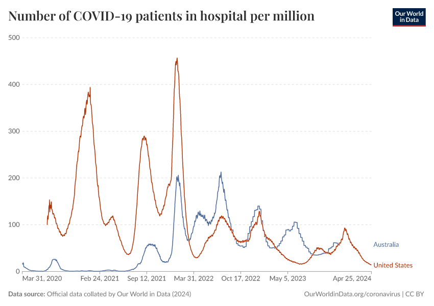 Official data collated by Our World in Data (2024) – processed by Our World in Data. “Number of COVID-19 patients in hospital per million” [dataset]. Official data collated by Our World in Data, “COVID-19, hospitalisations” [original data]. Retrieved February 6, 2026 from https://archive.ourworldindata.org/20250909-093708/grapher/current-covid-hospitalizations-per-million.html (archived on September 9, 2025).
