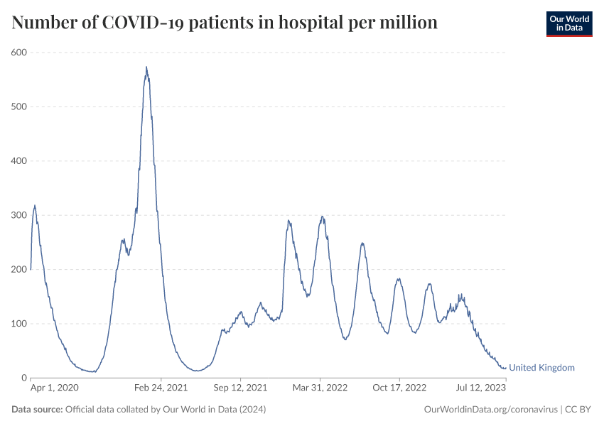 Official data collated by Our World in Data (2024) – processed by Our World in Data. “Number of COVID-19 patients in hospital per million” [dataset]. Official data collated by Our World in Data, “COVID-19, hospitalisations” [original data]. Retrieved January 11, 2026 from https://archive.ourworldindata.org/20250909-093708/grapher/current-covid-hospitalizations-per-million.html (archived on September 9, 2025).