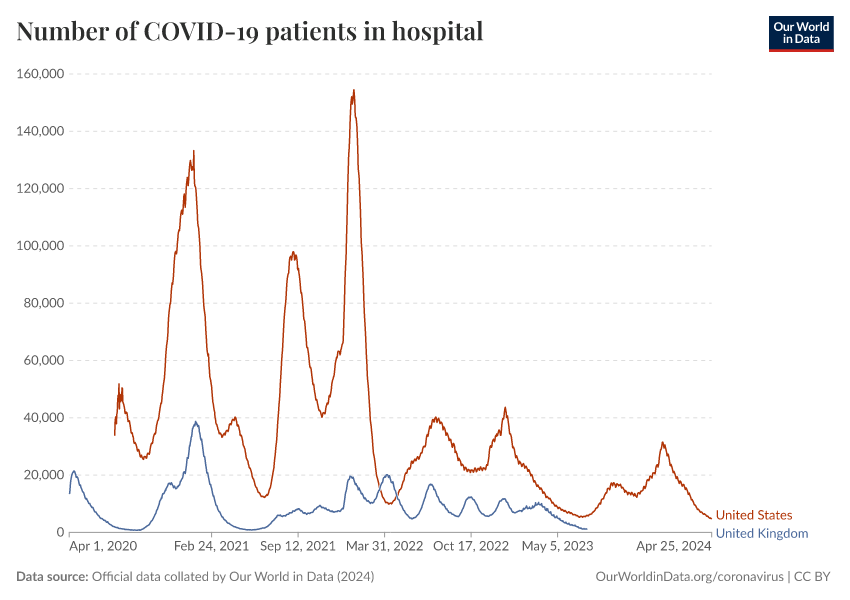 Official data collated by Our World in Data (2024) – processed by Our World in Data. “Number of COVID-19 patients in hospital” [dataset]. Official data collated by Our World in Data, “COVID-19, hospitalisations” [original data]. Retrieved March 23, 2026 from https://archive.ourworldindata.org/20260304-094028/grapher/current-covid-patients-hospital.html (archived on March 4, 2026).