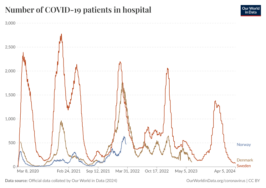 “Data Page: Number of COVID-19 patients in hospital”, part of the following publication: Edouard Mathieu, Hannah Ritchie, Lucas Rodés-Guirao, Cameron Appel, Daniel Gavrilov, Charlie Giattino, Joe Hasell, Bobbie Macdonald, Saloni Dattani, Diana Beltekian, Esteban Ortiz-Ospina, and Max Roser (2020) - “COVID-19 Pandemic”. Data adapted from Official data collated by Our World in Data. Retrieved from https://archive.ourworldindata.org/20260304-094028/grapher/current-covid-patients-hospital.html [online resource] (archived on March 4, 2026).