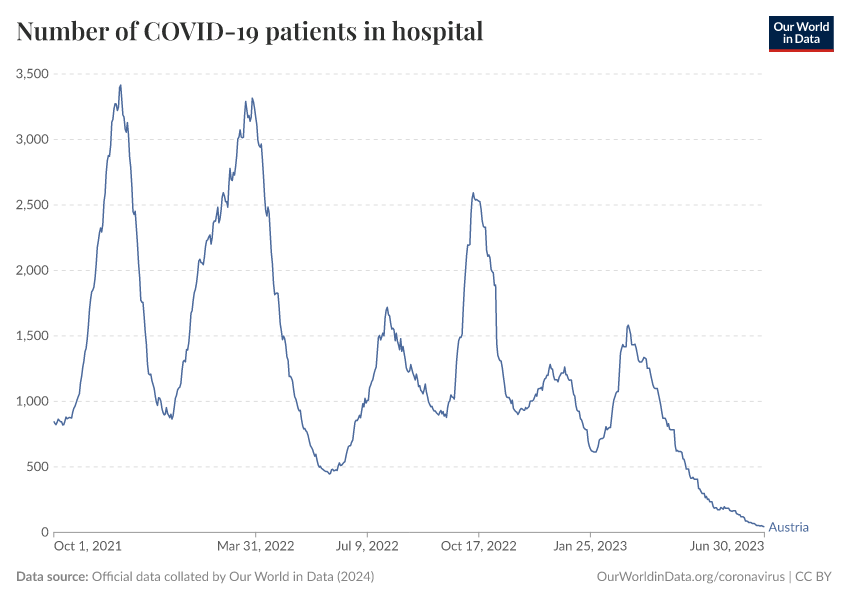 “Data Page: Number of COVID-19 patients in hospital”, part of the following publication: Edouard Mathieu, Hannah Ritchie, Lucas Rodés-Guirao, Cameron Appel, Daniel Gavrilov, Charlie Giattino, Joe Hasell, Bobbie Macdonald, Saloni Dattani, Diana Beltekian, Esteban Ortiz-Ospina, and Max Roser (2020) - “COVID-19 Pandemic”. Data adapted from Official data collated by Our World in Data. Retrieved from https://archive.ourworldindata.org/20250909-093708/grapher/current-covid-patients-hospital.html [online resource] (archived on September 9, 2025).