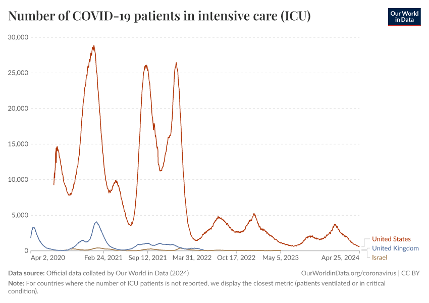 Official data collated by Our World in Data (2024) – processed by Our World in Data. “Number of COVID-19 patients in intensive care (ICU)” [dataset]. Official data collated by Our World in Data, “COVID-19, hospitalisations” [original data]. Retrieved January 16, 2026 from https://archive.ourworldindata.org/20250909-093708/grapher/current-covid-patients-icu.html (archived on September 9, 2025).