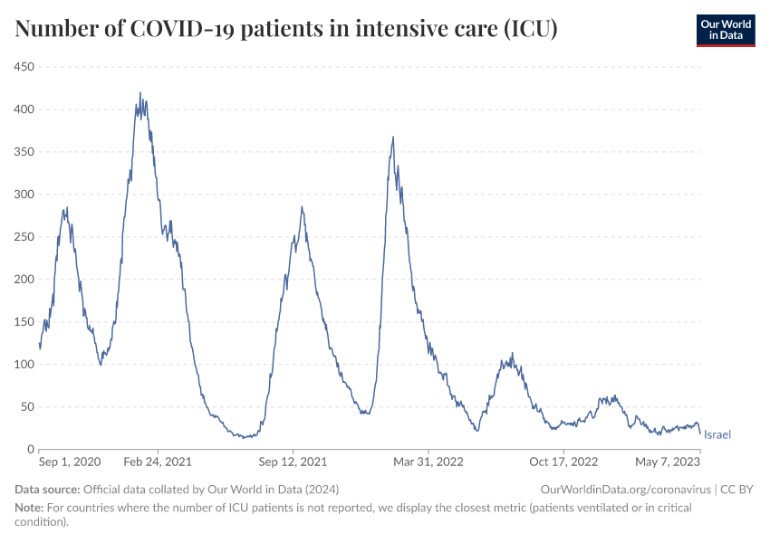 “Data Page: Number of COVID-19 patients in intensive care (ICU)”, part of the following publication: Edouard Mathieu, Hannah Ritchie, Lucas Rodés-Guirao, Cameron Appel, Daniel Gavrilov, Charlie Giattino, Joe Hasell, Bobbie Macdonald, Saloni Dattani, Diana Beltekian, Esteban Ortiz-Ospina, and Max Roser (2020) - “COVID-19 Pandemic”. Data adapted from Official data collated by Our World in Data. Retrieved from https://archive.ourworldindata.org/20250909-093708/grapher/current-covid-patients-icu.html [online resource] (archived on September 9, 2025).