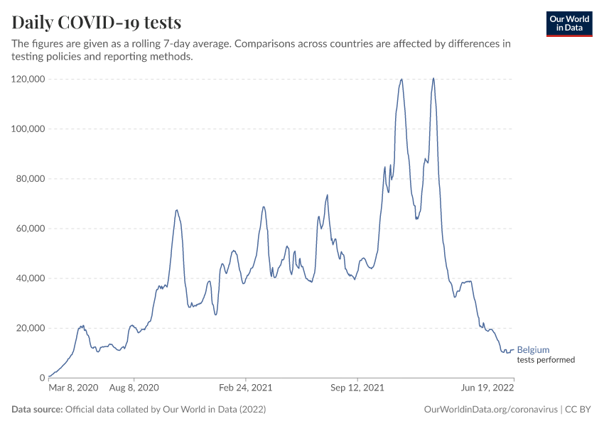 Official data collated by Our World in Data (2022) – with major processing by Our World in Data. “Daily COVID-19 tests” [dataset]. Official data collated by Our World in Data, “COVID-19, testing” [original data]. Retrieved January 11, 2026 from https://archive.ourworldindata.org/20250909-093708/grapher/daily-covid-19-tests-smoothed-7-day.html (archived on September 9, 2025).