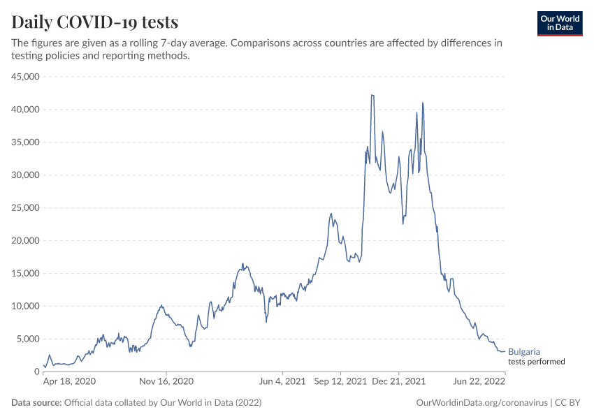 Official data collated by Our World in Data (2022) – with major processing by Our World in Data. “Daily COVID-19 tests” [dataset]. Official data collated by Our World in Data, “COVID-19, testing” [original data]. Retrieved February 19, 2026 from https://archive.ourworldindata.org/20250909-093708/grapher/daily-covid-19-tests-smoothed-7-day.html (archived on September 9, 2025).