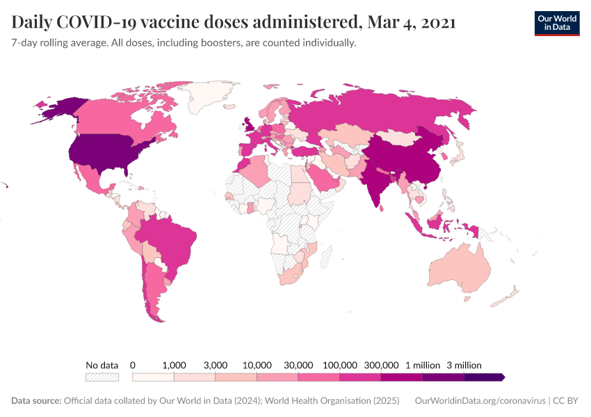 “Data Page: Daily COVID-19 vaccine doses administered”, part of the following publication: Edouard Mathieu, Hannah Ritchie, Lucas Rodés-Guirao, Cameron Appel, Daniel Gavrilov, Charlie Giattino, Joe Hasell, Bobbie Macdonald, Saloni Dattani, Diana Beltekian, Esteban Ortiz-Ospina, and Max Roser (2020) - “COVID-19 Pandemic”. Data adapted from Official data collated by Our World in Data, World Health Organisation. Retrieved from https://archive.ourworldindata.org/20250909-093708/grapher/daily-covid-19-vaccination-doses.html [online resource] (archived on September 9, 2025).How to cite this data