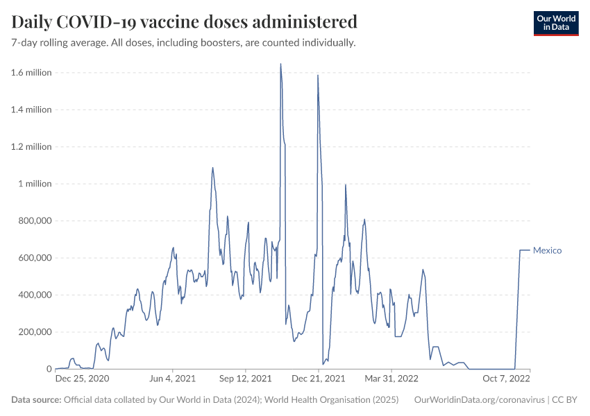 “Data Page: Daily COVID-19 vaccine doses administered”, part of the following publication: Edouard Mathieu, Hannah Ritchie, Lucas Rodés-Guirao, Cameron Appel, Daniel Gavrilov, Charlie Giattino, Joe Hasell, Bobbie Macdonald, Saloni Dattani, Diana Beltekian, Esteban Ortiz-Ospina, and Max Roser (2020) - “COVID-19 Pandemic”. Data adapted from Official data collated by Our World in Data, World Health Organisation. Retrieved from https://archive.ourworldindata.org/20250909-093708/grapher/daily-covid-19-vaccination-doses.html [online resource] (archived on September 9, 2025).How to cite this data