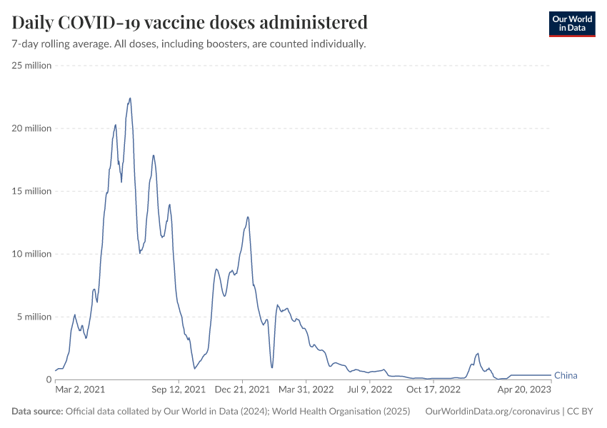 Official data collated by Our World in Data (2024); World Health Organisation (2025) – with major processing by Our World in Data. “Daily COVID-19 vaccine doses administered” [dataset]. Official data collated by Our World in Data, “COVID-19, vaccinations”; World Health Organisation, “COVID-19, vaccinations (WHO)” [original data]. Retrieved February 21, 2026 from https://archive.ourworldindata.org/20260119-065148/grapher/daily-covid-19-vaccination-doses.html (archived on January 19, 2026).