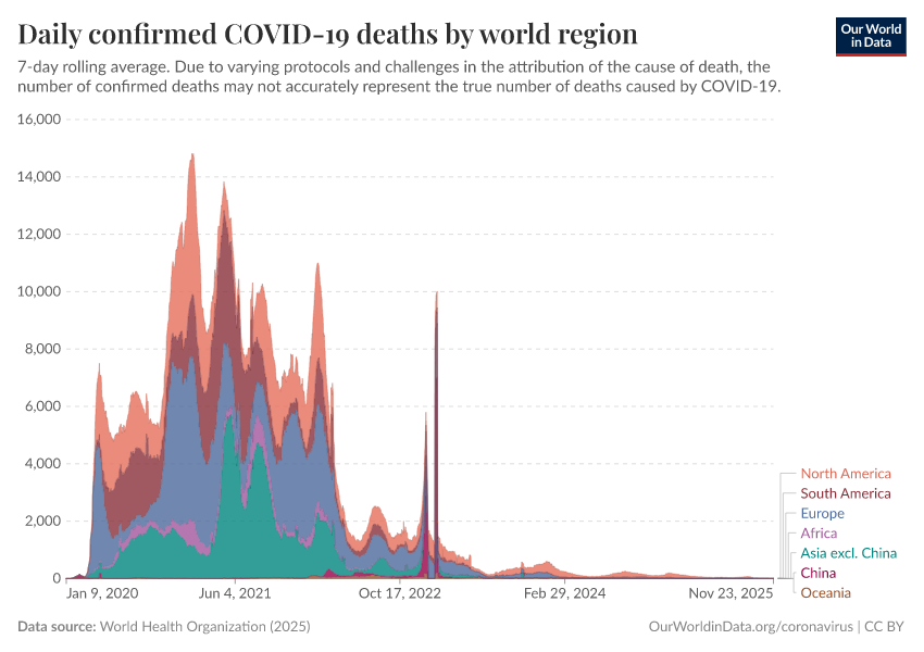 “Data Page: Daily confirmed COVID-19 deaths by world region”, part of the following publication: Edouard Mathieu, Hannah Ritchie, Lucas Rodés-Guirao, Cameron Appel, Daniel Gavrilov, Charlie Giattino, Joe Hasell, Bobbie Macdonald, Saloni Dattani, Diana Beltekian, Esteban Ortiz-Ospina, and Max Roser (2020) - “COVID-19 Pandemic”. Data adapted from World Health Organization. Retrieved from https://archive.ourworldindata.org/20251220-063401/grapher/daily-covid-deaths-region.html [online resource] (archived on December 20, 2025).