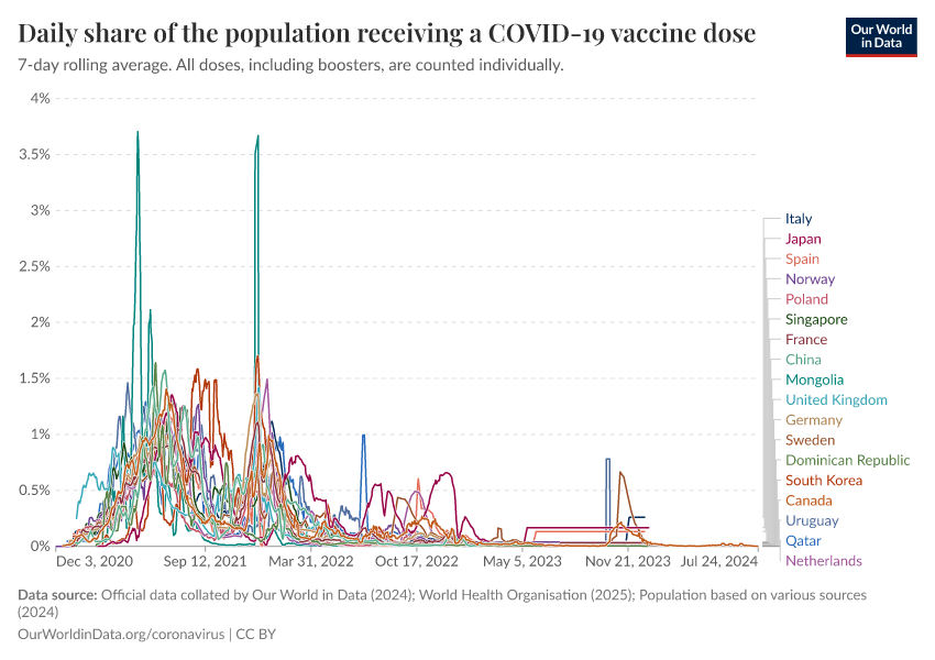Official data collated by Our World in Data (2024); World Health Organisation (2025); Population based on various sources (2024) – with major processing by Our World in Data. “Daily share of the population receiving a COVID-19 vaccine dose” [dataset]. Official data collated by Our World in Data, “COVID-19, vaccinations”; World Health Organisation, “COVID-19, vaccinations (WHO)”; Various sources, “Population” [original data]. Retrieved January 20, 2026 from https://archive.ourworldindata.org/20260119-065148/grapher/daily-covid-vaccination-doses-per-capita.html (archived on January 19, 2026).