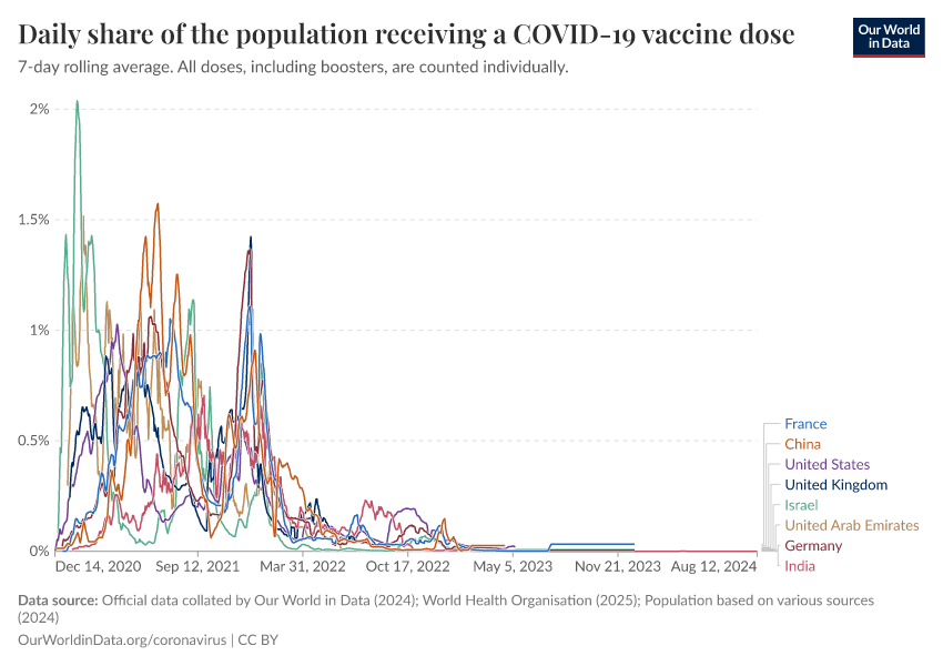 Official data collated by Our World in Data (2024); World Health Organisation (2025); Population based on various sources (2024) – with major processing by Our World in Data. “Daily share of the population receiving a COVID-19 vaccine dose” [dataset]. Official data collated by Our World in Data, “COVID-19, vaccinations”; World Health Organisation, “COVID-19, vaccinations (WHO)”; Various sources, “Population” [original data]. Retrieved April 4, 2026 from https://archive.ourworldindata.org/20260402-164039/grapher/daily-covid-vaccination-doses-per-capita.html (archived on April 2, 2026).